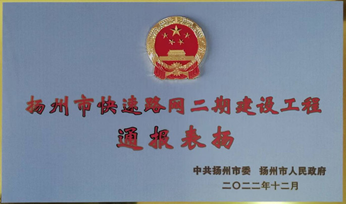 我公司承建的揚(yáng)州市快速路網(wǎng)二期建設(shè)工程獲中共揚(yáng)州市委、揚(yáng)州市人民政府通報(bào)表?yè)P(yáng)!